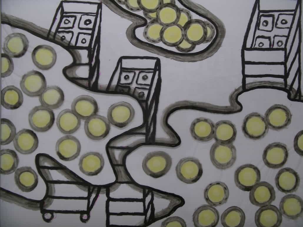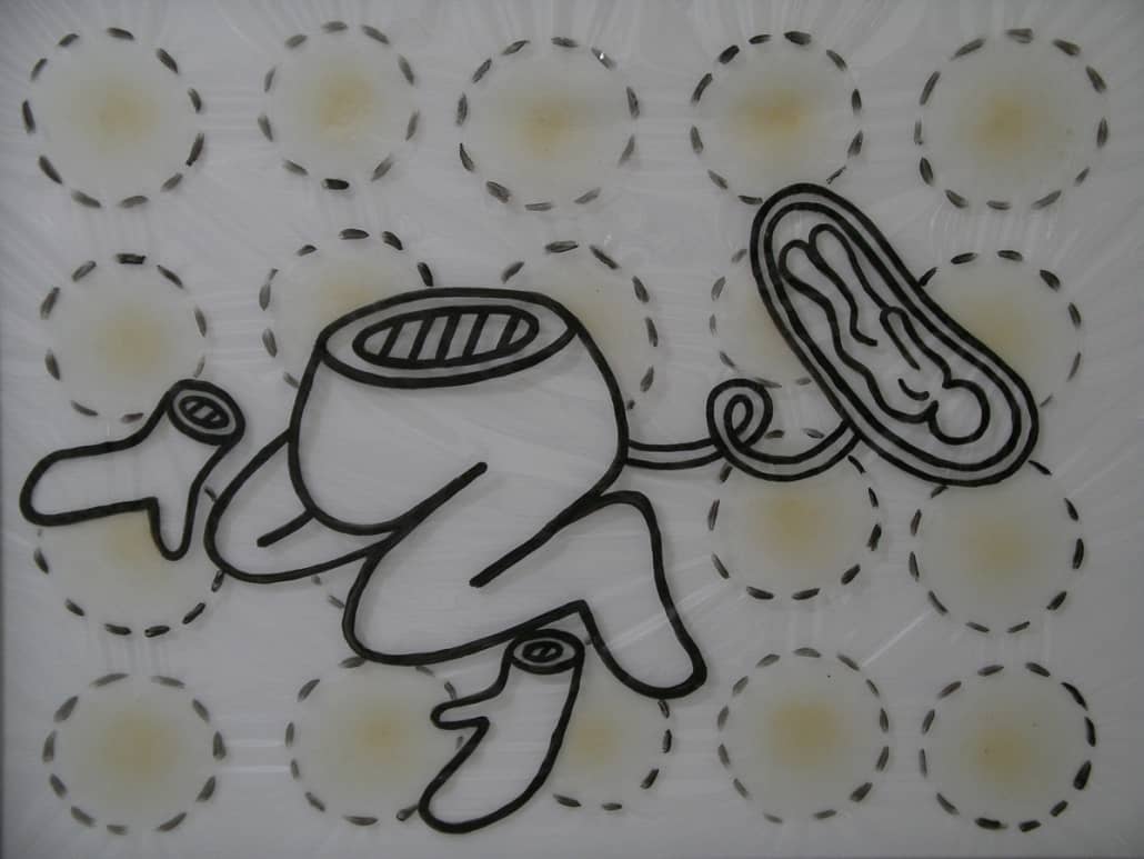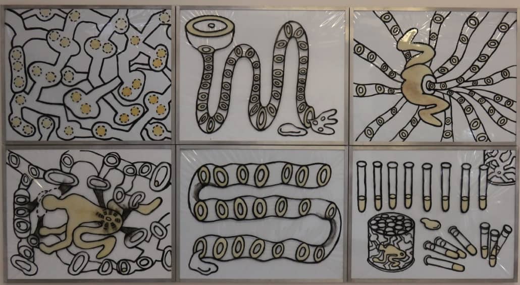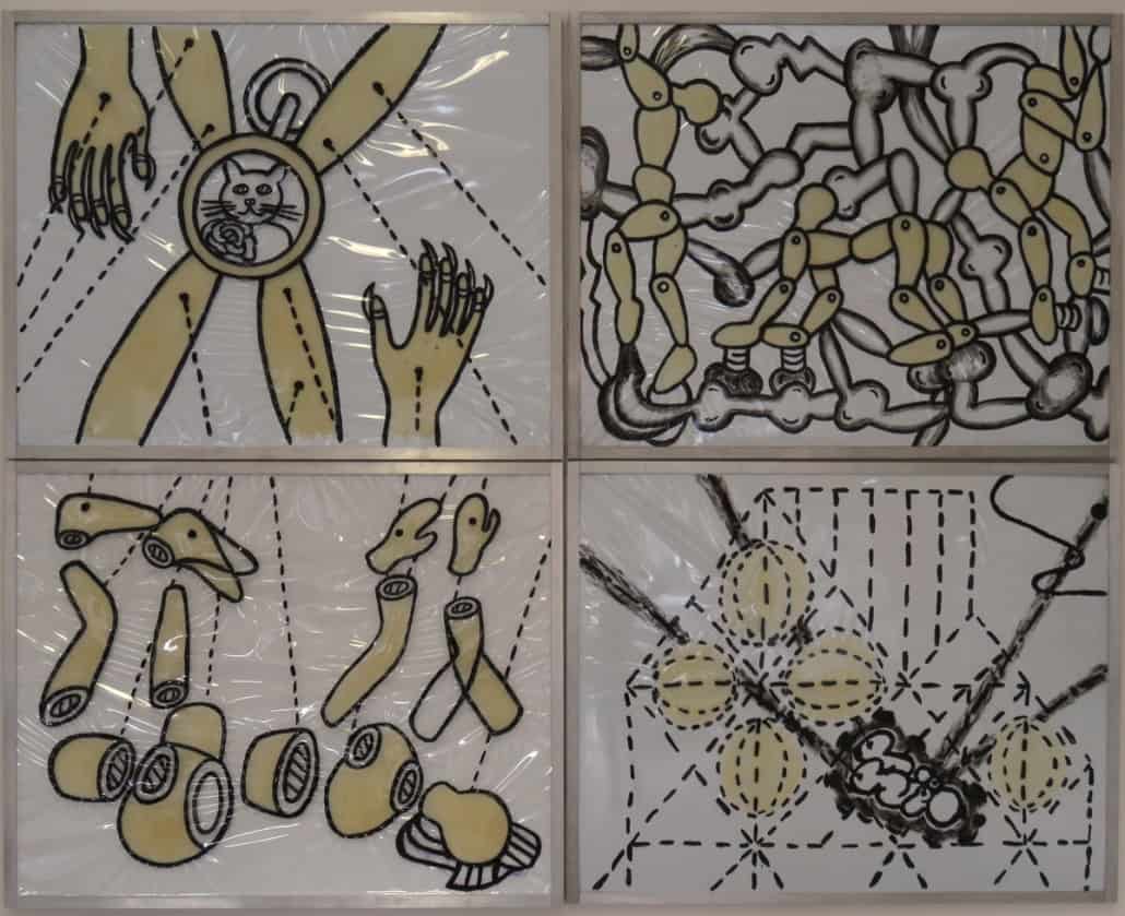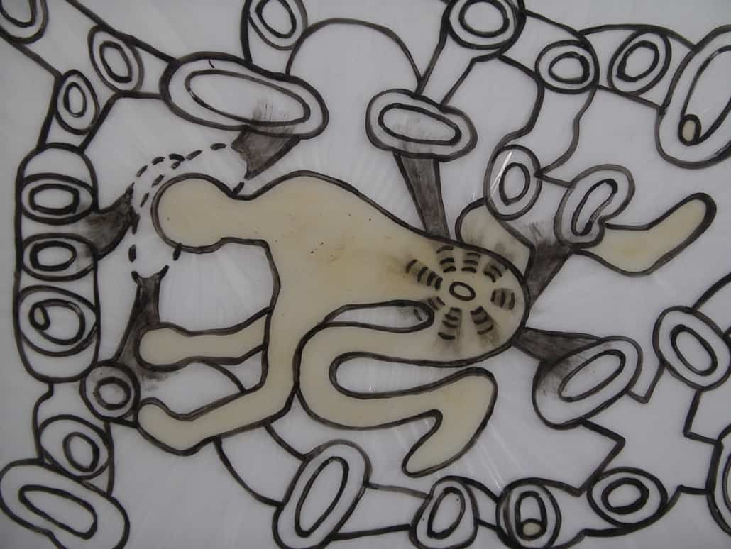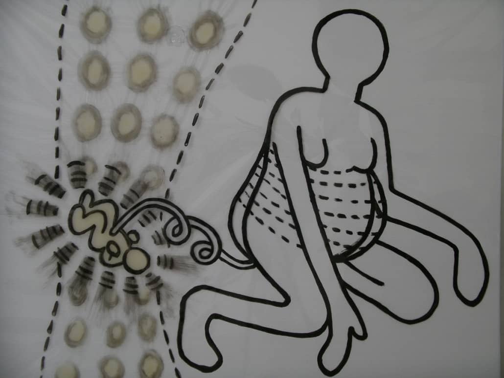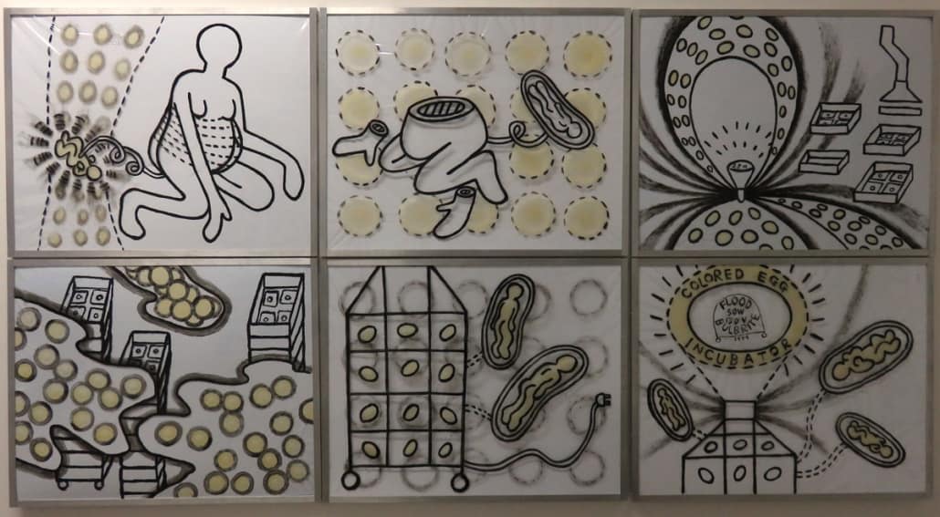 This series is about women’s reproductive experiences: women’s bodies going through physiological changes, child bearing and nurturing, artificial insemination, sexual violence, and the body being controlled by other forces. I drew these images on vinyl sheets, then stretched them over ColorCore panels. I also used LED lights to brighten the drawings from behind, trying to create light box effects.