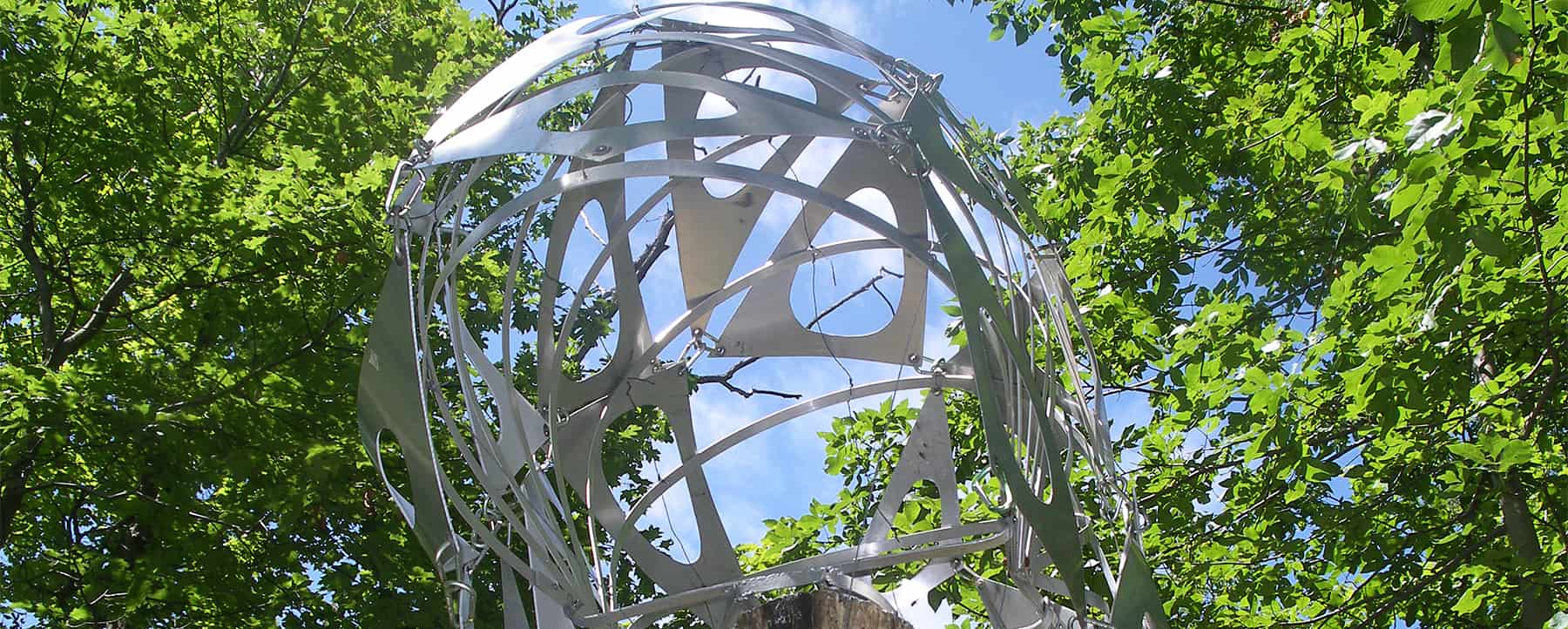 When raising my family an image of a cloth flying outside a window of the home became a symbol of freedom for me. I imagined ‘Flying Cloth’ being something unreachable and desirable. I tried to capture the light, flexible, and airy quality of this ‘flying cloth’ in my sculptures using thin-gauged aluminum cut-outs, and hanging them from trees and other structures. I was also working on the human scale shelter sculptures at the same time, which were architectural and solidly grounded. Eventually combining these two different modes of works to form a unified whole, I created tensile and flexible but structurally strong sculptures in steel and aluminum. Sometimes they are like shelters with an airy-quality and an observer may walk within, sit down, or pass through, and other times they are just to be observed.