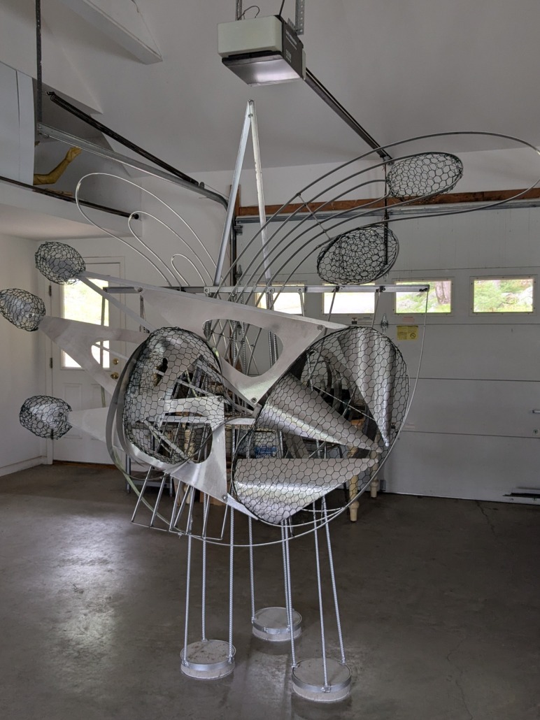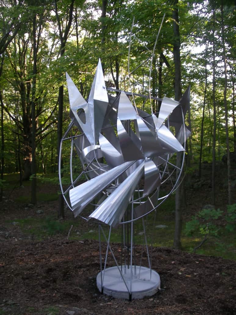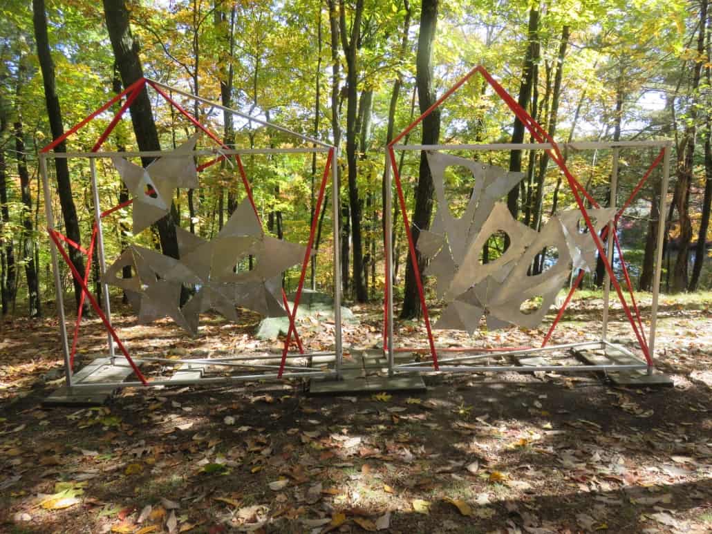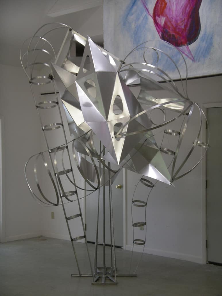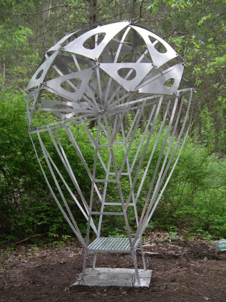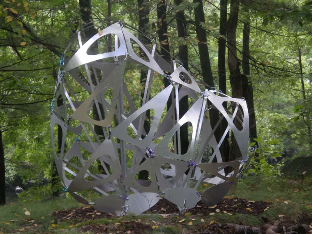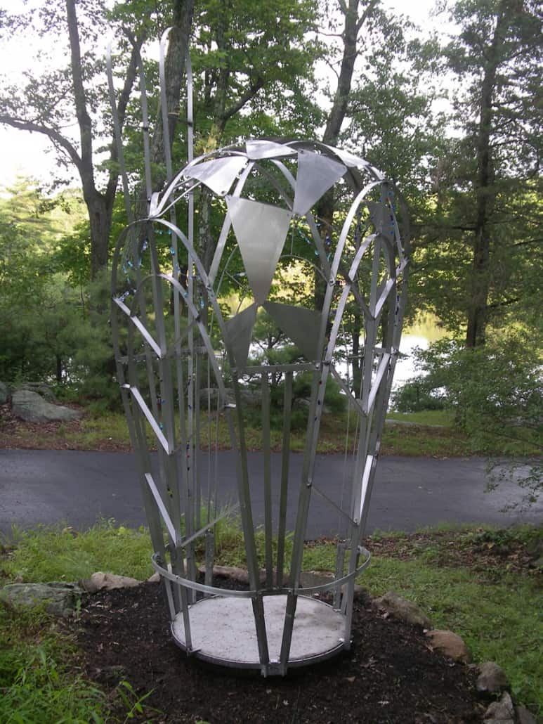 When raising my family an image of a cloth flying outside a window of the home became a symbol of freedom for me. I imagined ‘Flying Cloth’ being something unreachable and desirable. I tried to capture the light, flexible, and airy quality of this ‘flying cloth’ in my sculptures using thin-gauged aluminum cut-outs, and hanging them from trees and other structures. I was also working on the human scale shelter sculptures at the same time, which were architectural and solidly grounded. Eventually combining these two different modes of works to form a unified whole, I created tensile and flexible but structurally strong sculptures in steel and aluminum. Sometimes they are like shelters with an airy-quality and an observer may walk within, sit down, or pass through, and other times they are just to be observed.