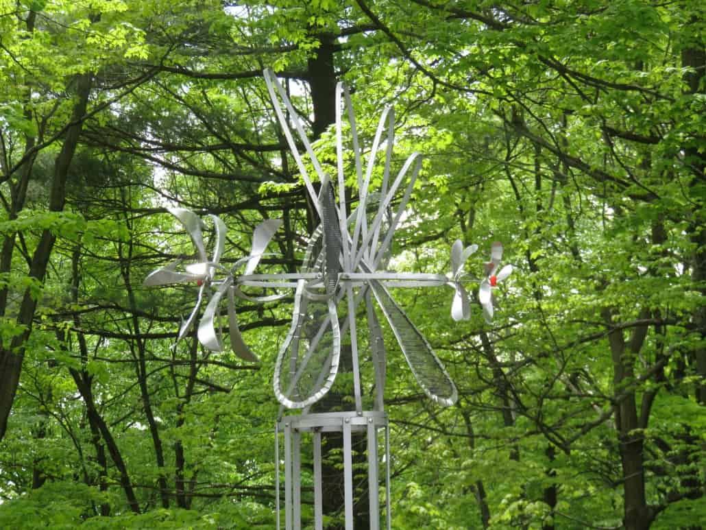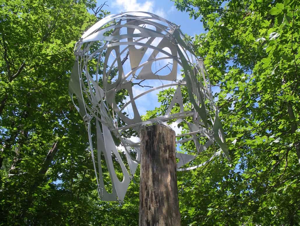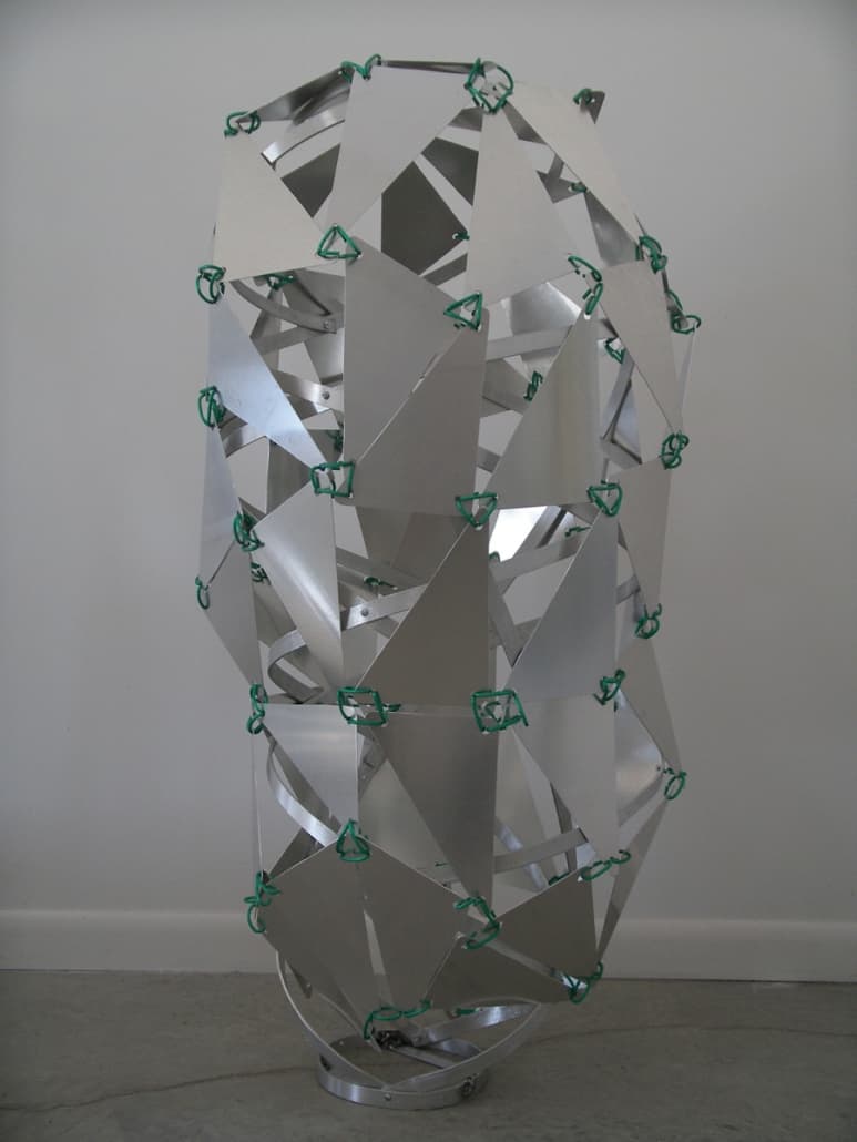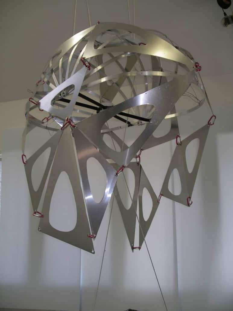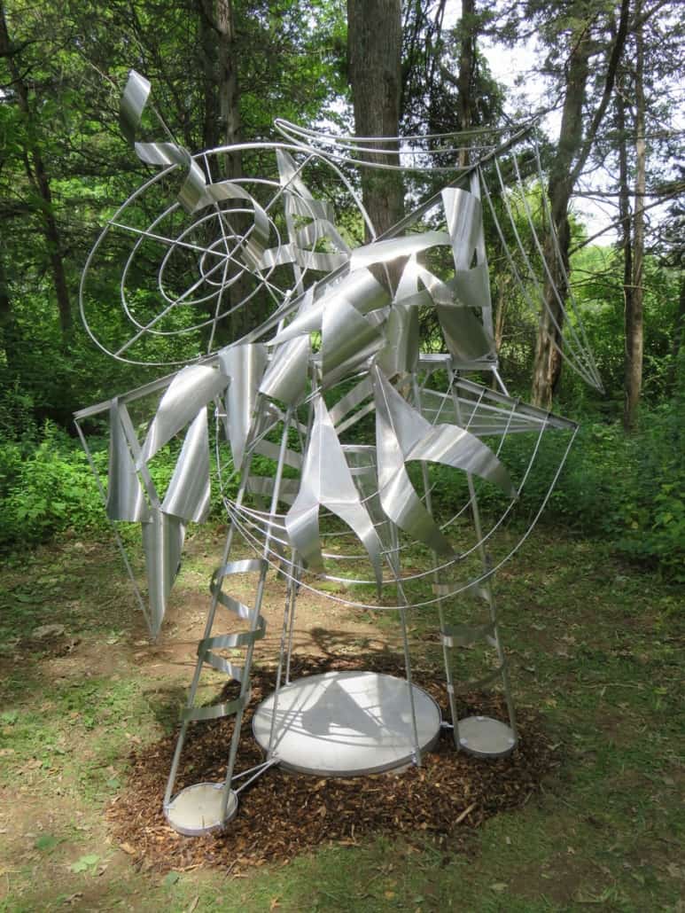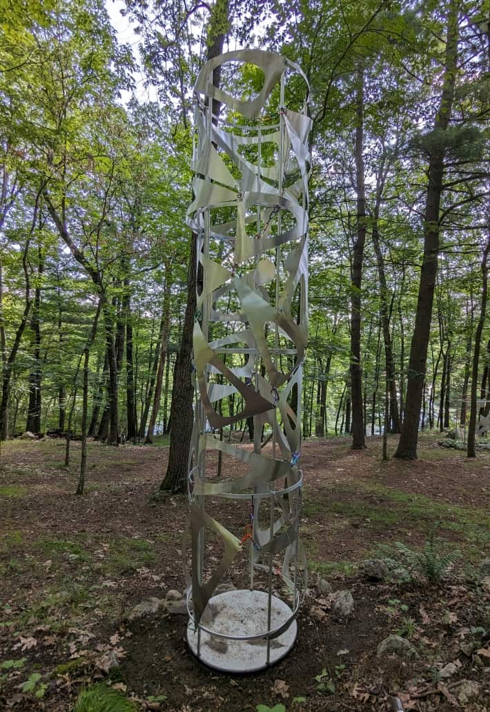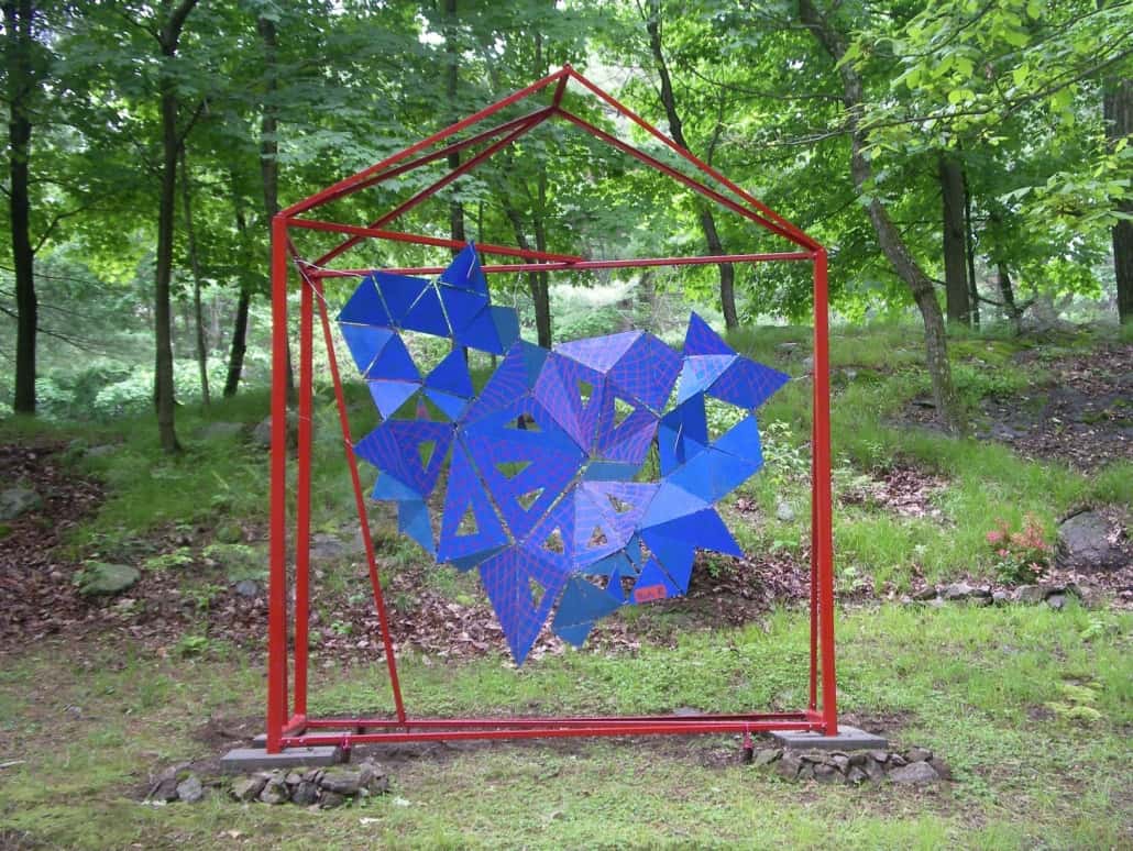 When raising my family an image of a cloth flying outside a window of the home became a symbol of freedom for me. I imagined ‘Flying Cloth’ being something unreachable and desirable. I tried to capture the light, flexible, and airy quality of this ‘flying cloth’ in my sculptures using thin-gauged aluminum cut-outs, and hanging them from trees and other structures. I was also working on the human scale shelter sculptures at the same time, which were architectural and solidly grounded. Eventually combining these two different modes of works to form a unified whole, I created tensile and flexible but structurally strong sculptures in steel and aluminum. Sometimes they are like shelters with an airy-quality and an observer may walk within, sit down, or pass through, and other times they are just to be observed.