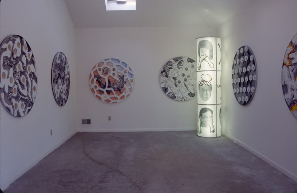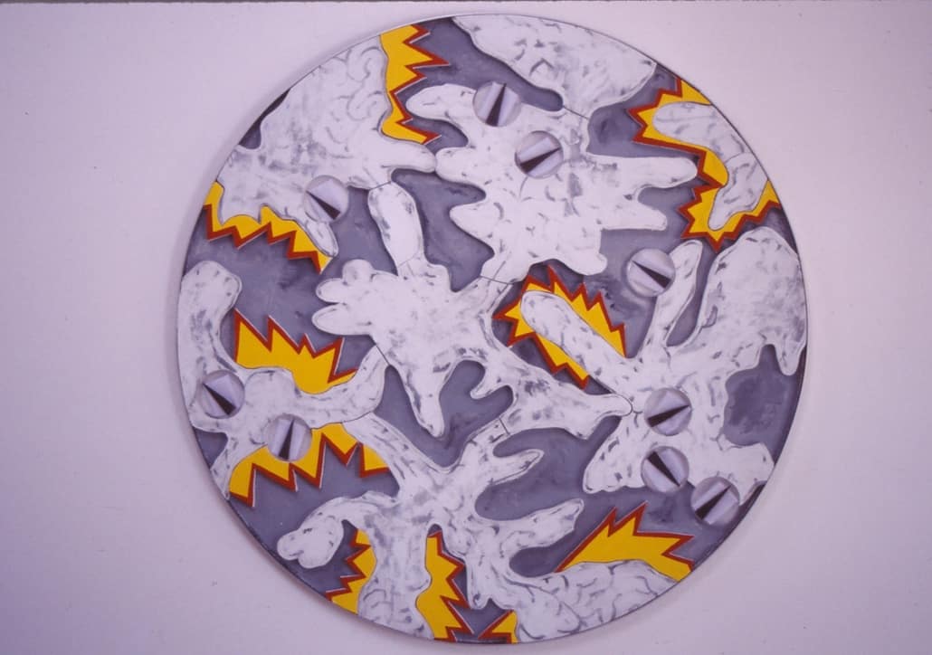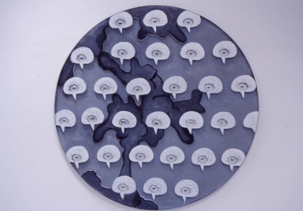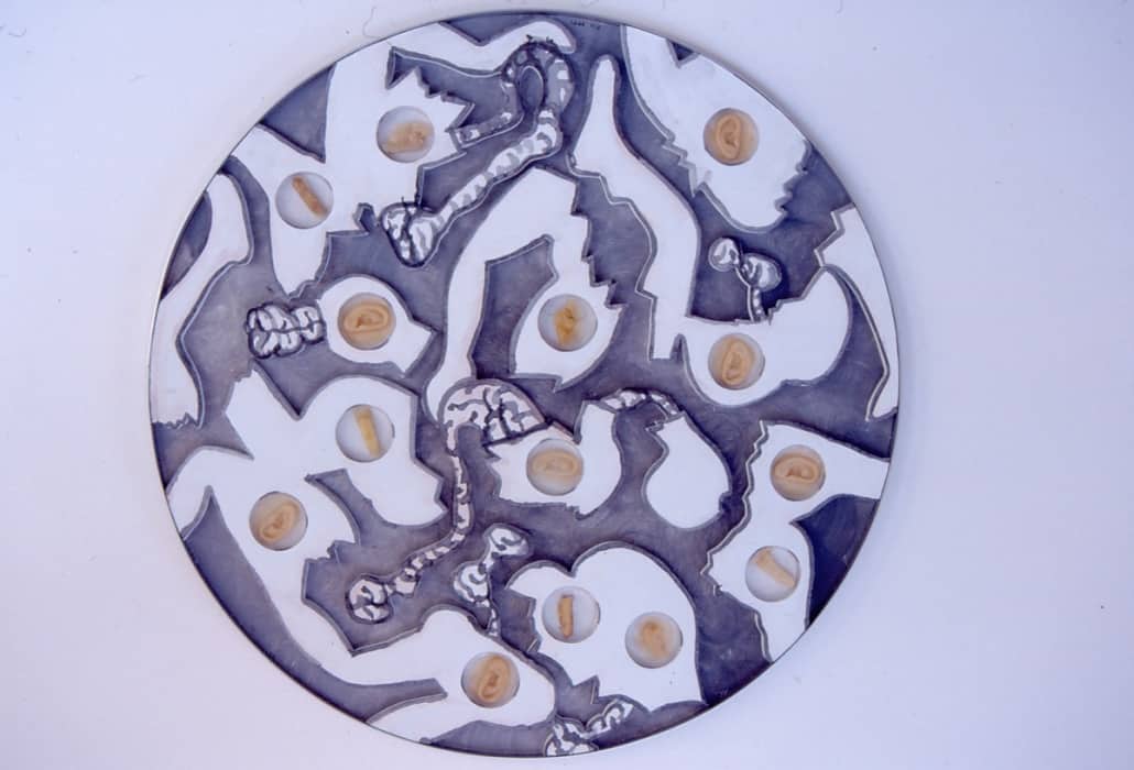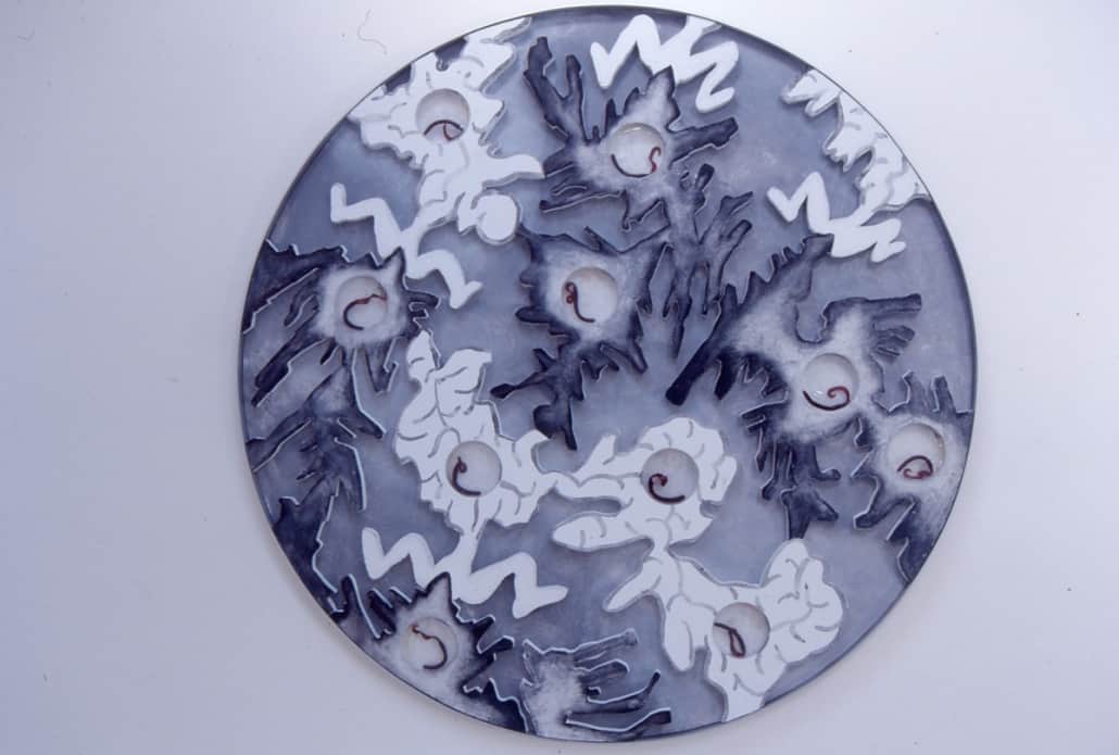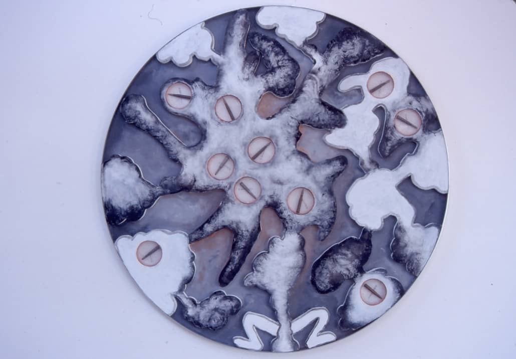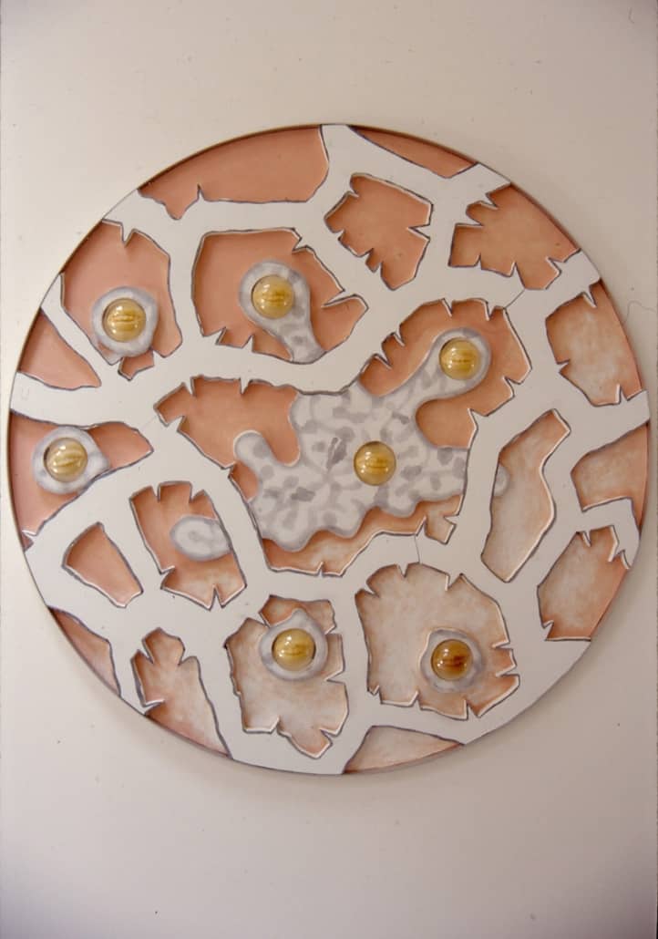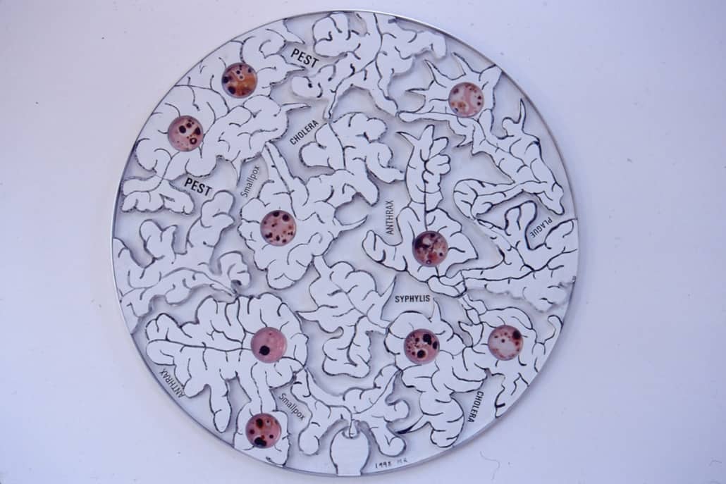 The wall relief series “Magnified Field” was born from this background, in a circular format, representing both the Asian hemisphere of the world and microscopic fields which focus in on specimens of war. Through this series, I reflect on the history and investigate issues such as racism, colonialism, power, aggression, intimidation among countries, isolation, biological warfare and scientific conscience, survival, brainwashing, fanaticism, culture clash and intolerance.