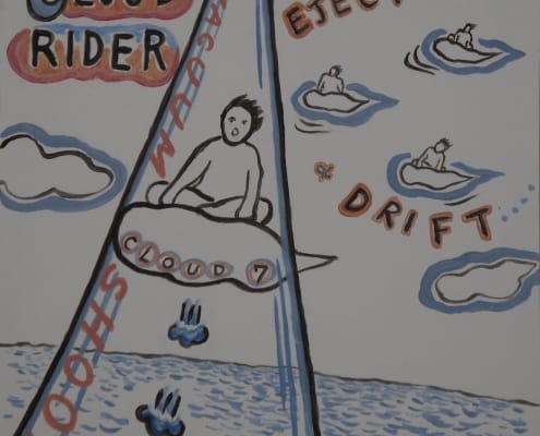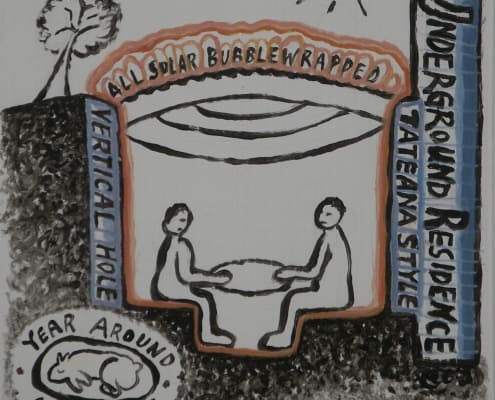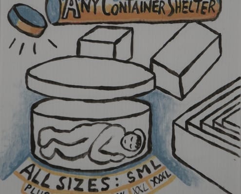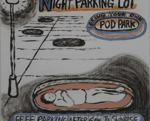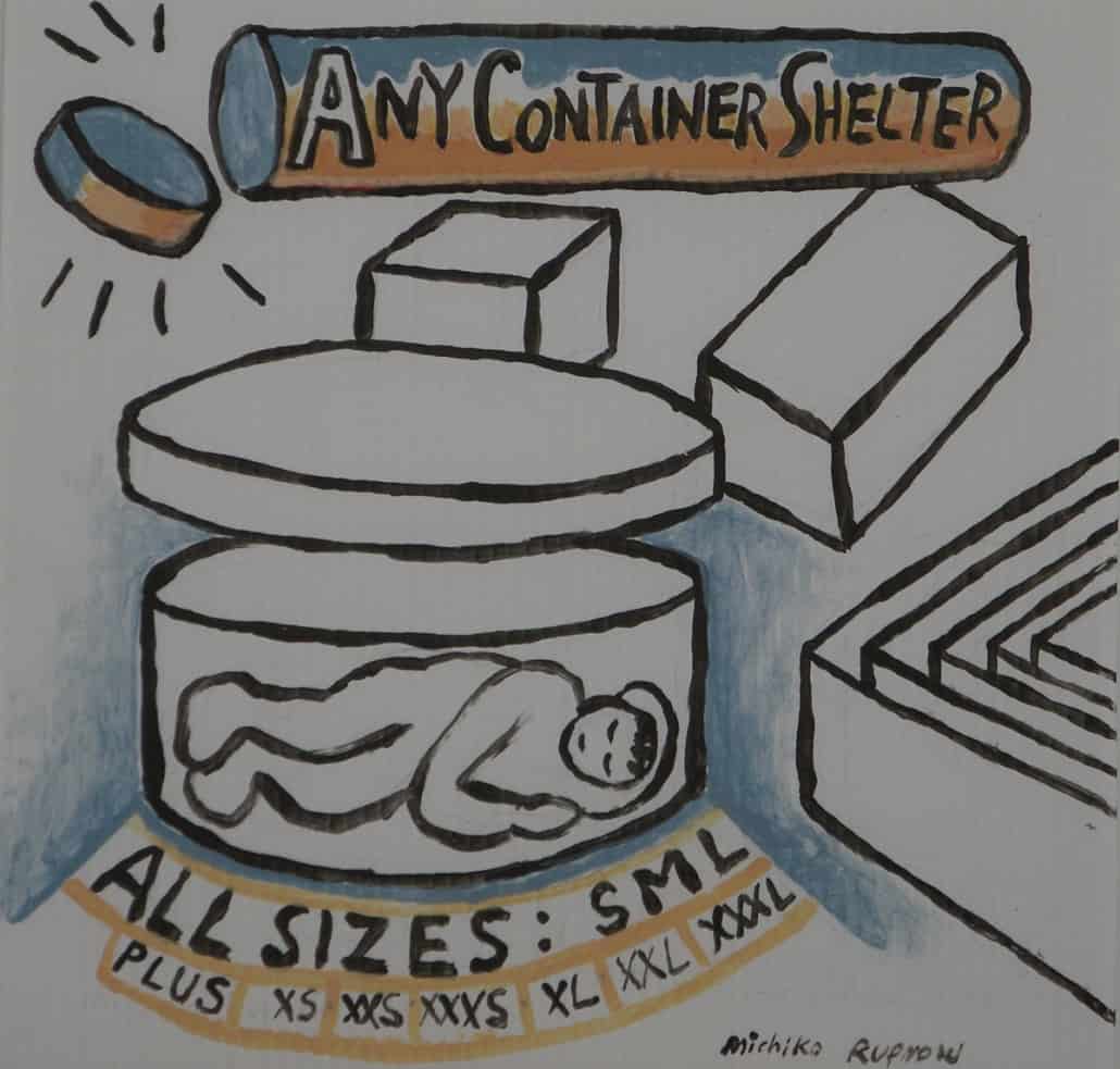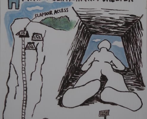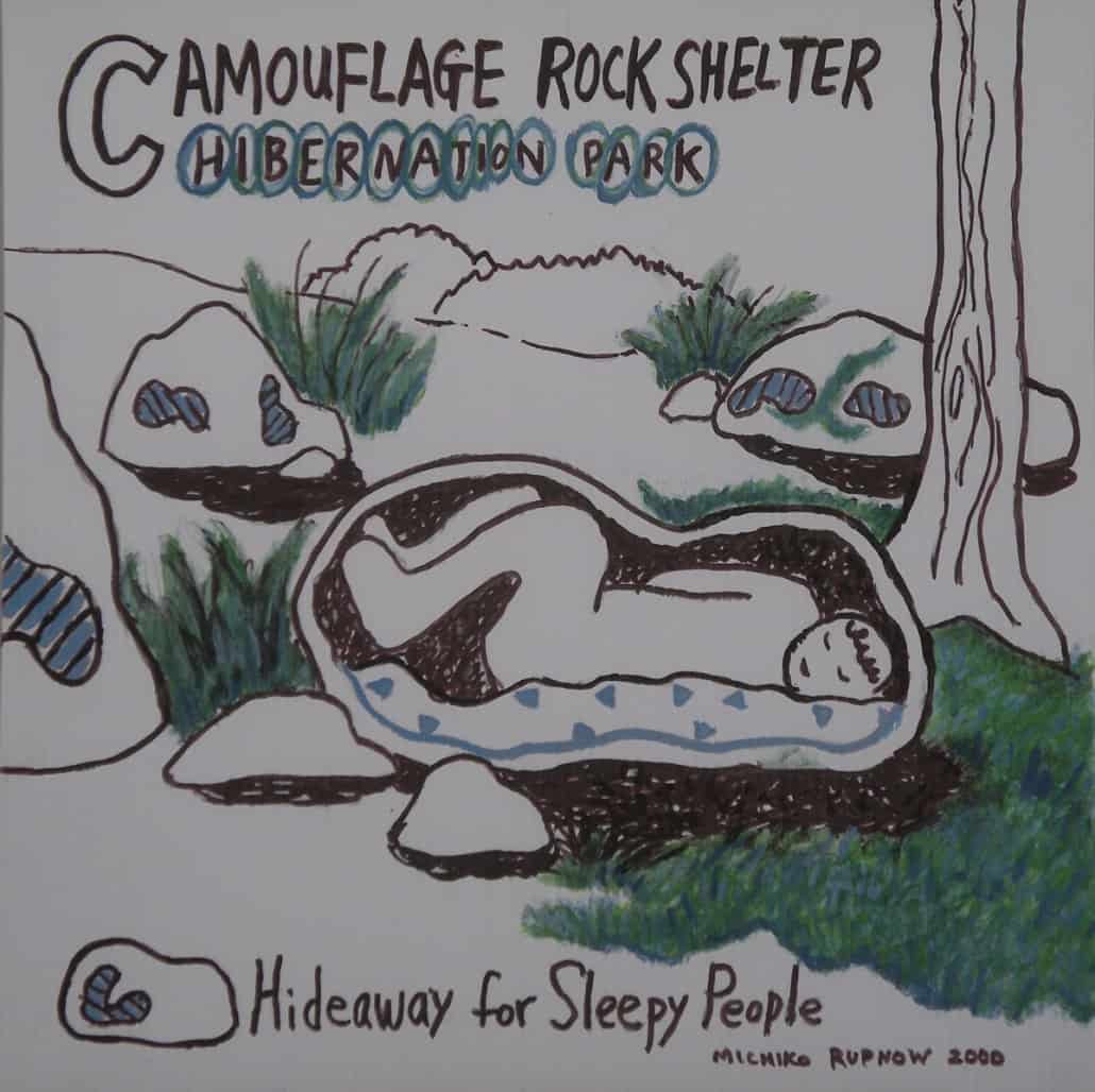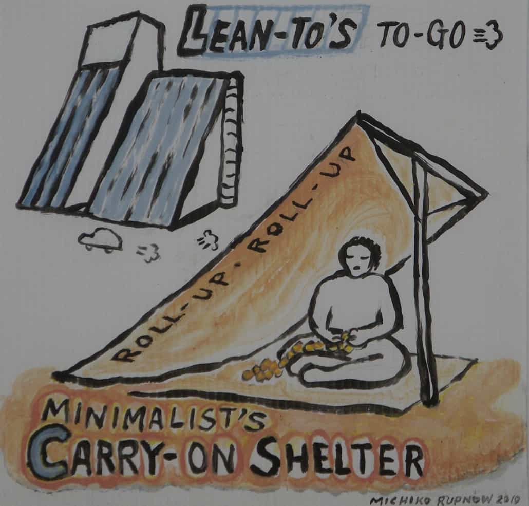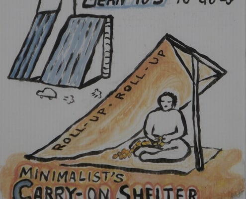 When I was developing my sculpture series “Temporary Shelters,” I was casually drawing many different versions. Later I made cleaned-up versions of these concept drawings using acrylic paint on plastic boards.